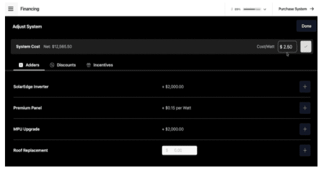 Let’s say, for example, that during a meeting with a homeowner, you learn that they are planning to purchase an electric vehicle or air conditioning system that may drastically increase their future electricity bills. A flexible solar company should be able to adjust instantly by adding panels to the design and seeing the impact on bill savings in real-time.
