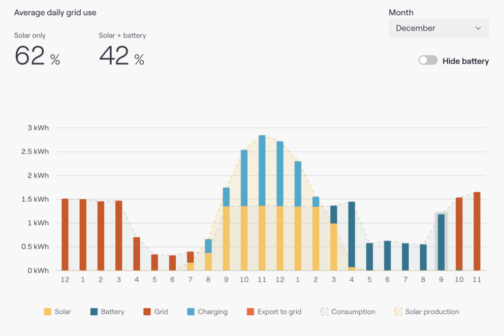 Once you click on “Daily Usage” you can select any month of the year, and it will show how much electricity, on average, the customer is pulling from the grid with solar only versus solar plus batteries. Let’s first look at August as an example. In August, with solar only, the homeowner is still pulling 51% of their power from the grid on a daily basis, but with a battery system that goes down to 0%. (You can also see that there’s a “Hide battery” toggle, so you can show how things look without battery storage.)