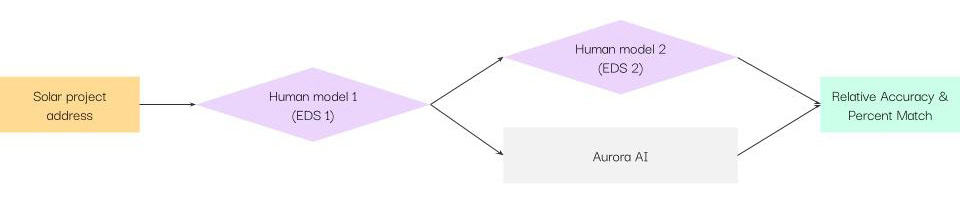 The first approach, called “Relative Accuracy,” measures the total number of panels that can fit on a roof as generated by Aurora AI and as drawn by a human designer. Then the two sets of panel counts are compared to the original design. This method was introduced in response to customer feedback, asking for real-world measurements. The closer the AI-generated design and the human-drawn design panel counts were, the better Aurora AI was considered to perform.